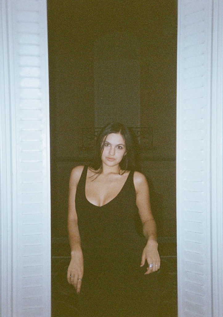 4. Get ready and change into a fun birthday outfit – a light pink sparkly midi skirt, black tank top, and black ballet flats.